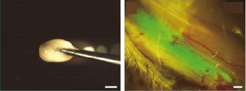 図1 作成したシートペレットとマウス前脛骨筋に移植したGFP陽性組織