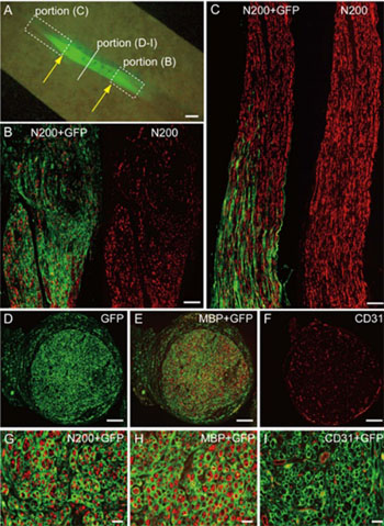 (移植したGFP細胞は血管、神経、結合組織を活発に作成し、大きな欠損部を埋めた。)